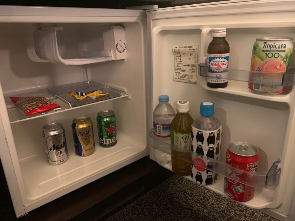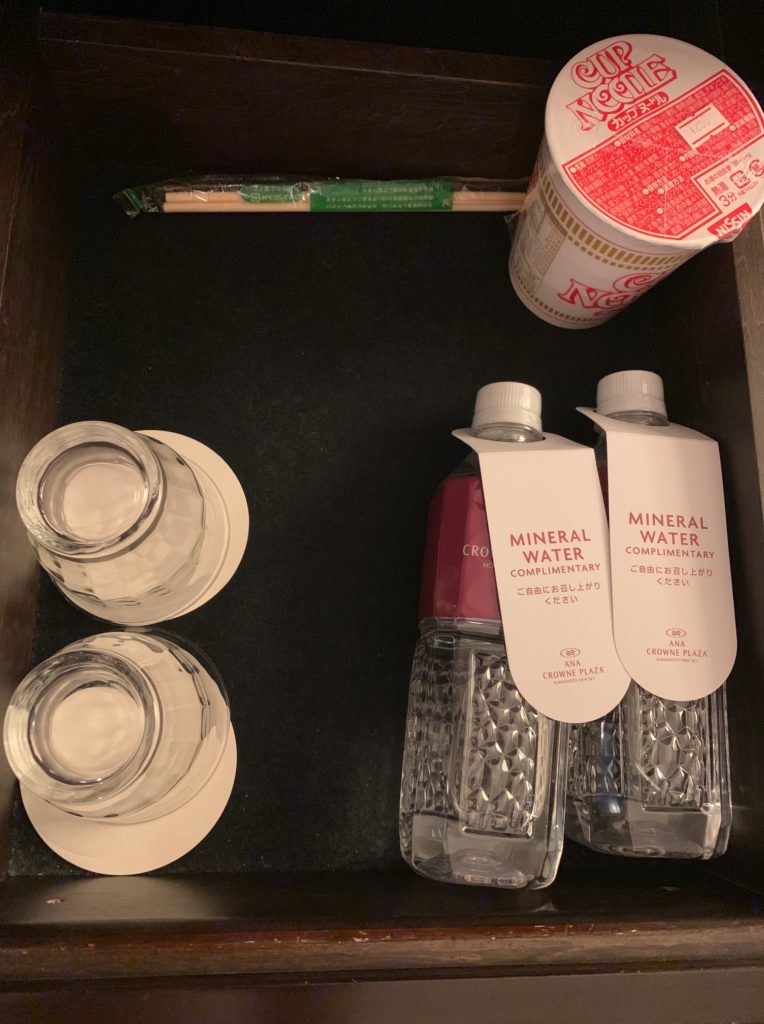キャビネットの中身は無料のミネラルウォーター、食器、ミニバーなど
