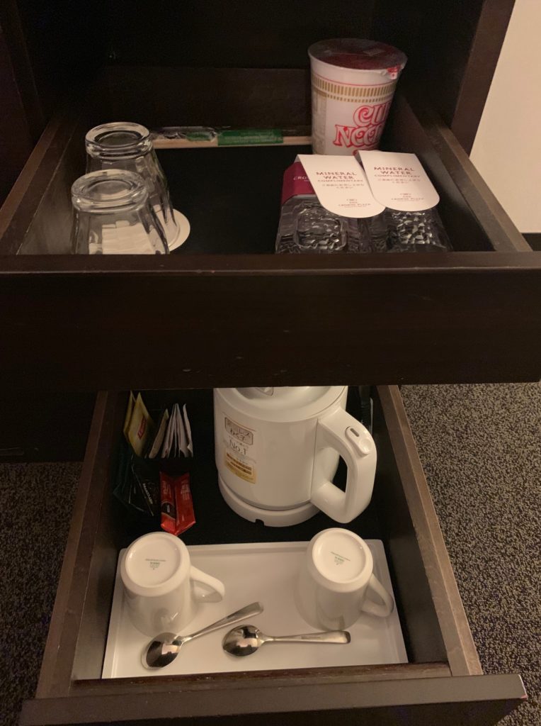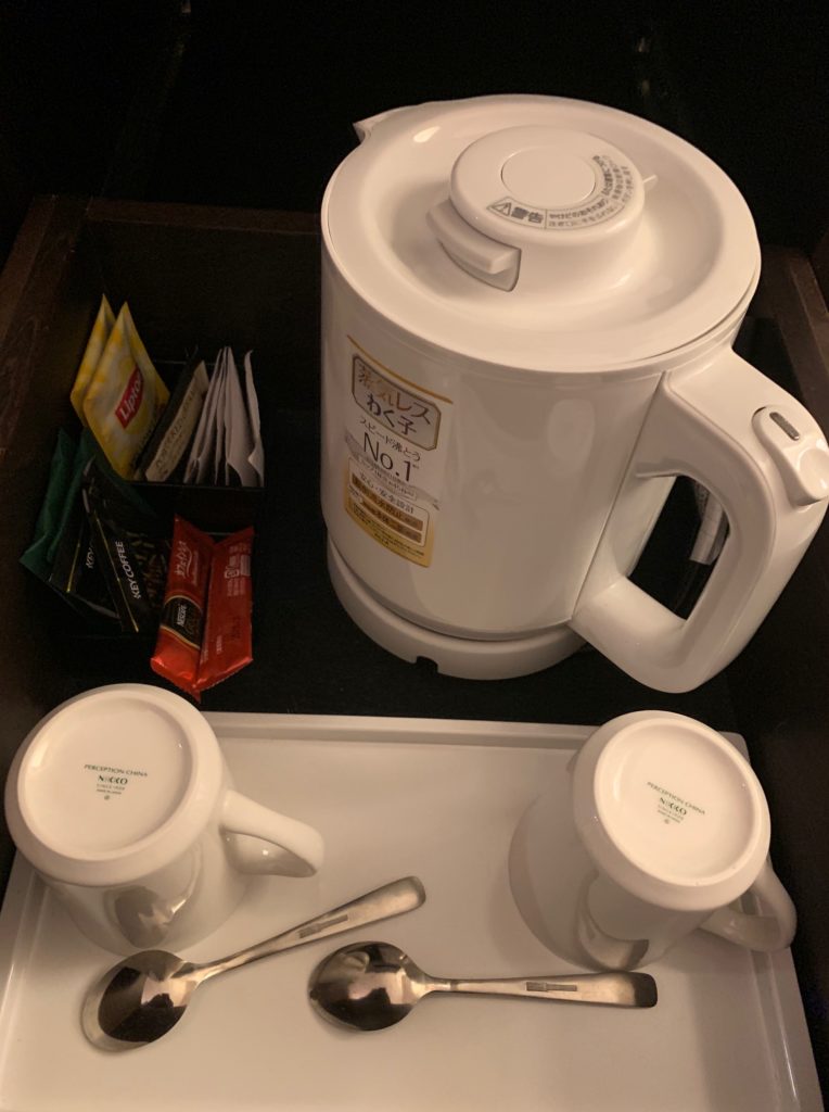 下段は電気ケトル、カップ、無料のコーヒーや紅茶