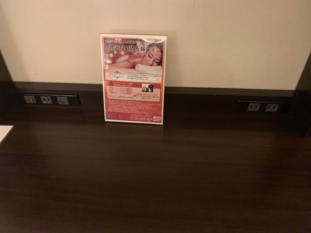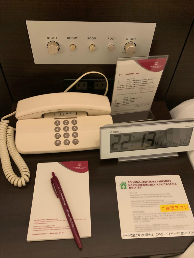 枕元には室内照明のスイッチ、時計、電話、コンセント2口があります