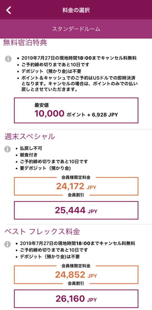 この日の最安のお部屋の値段は以下の通りで週末のためか高めとなっていました