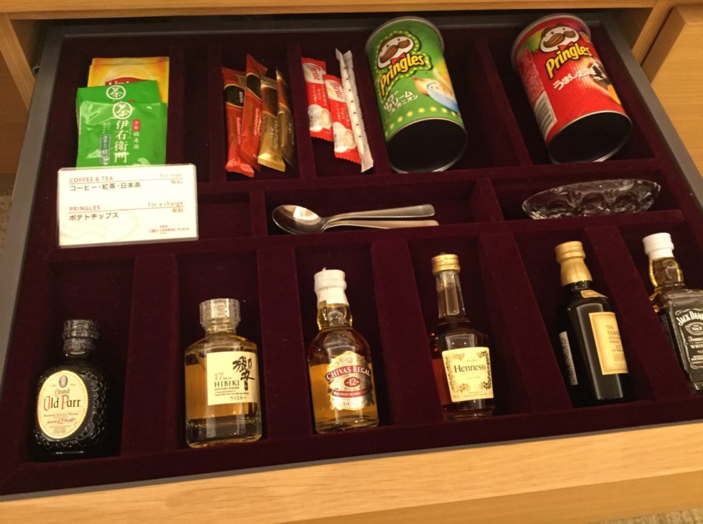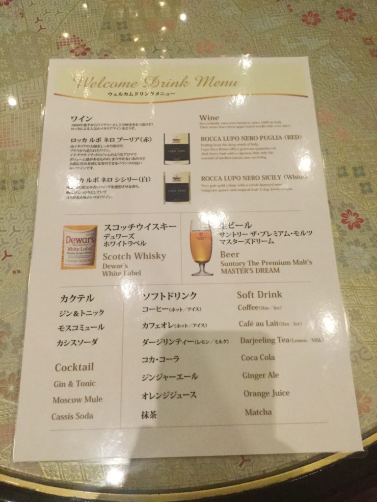 IHGリワーズクラブゴールド会員以上はポイントあるいはウェルカムドリンク券をもらえます。他のホテルではゴールド、プラチナ、スパイア会員で選択できるドリンクの種類に違いがあったりしますが、ANAクラウンプラザホテル京都では以下の写真のように同一メニューとなります。