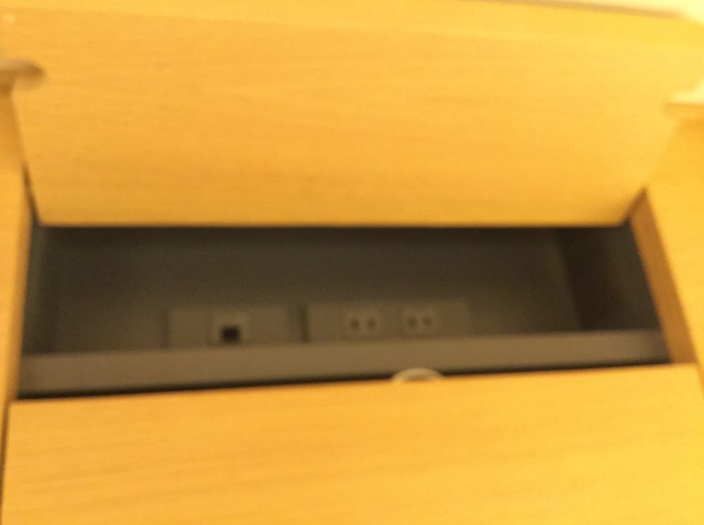 奥を開けるとコンセントやLANコンセントがあります(ピンボケですみません…)