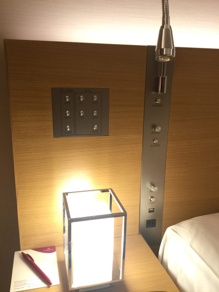 枕元には行灯のような灯りがあります。またコンセントやUSBコンセントもあり機能的です