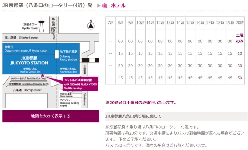 京都地下鉄路線図そのためかJR京都駅八条口⇔ホテル間はシャトルバスが運行されています。ただ朝は8時台から、夜は19時台(土曜のみ20時台)までと時間が短く注意が必要です。