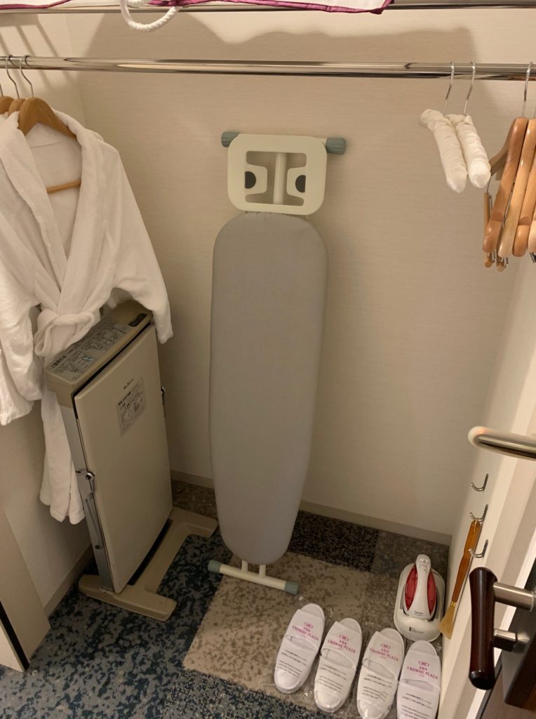 ズボンプレッサー・アイロン・アイロン台・ハンガー・バスローブ・スリッパ・靴べらが置かれています。