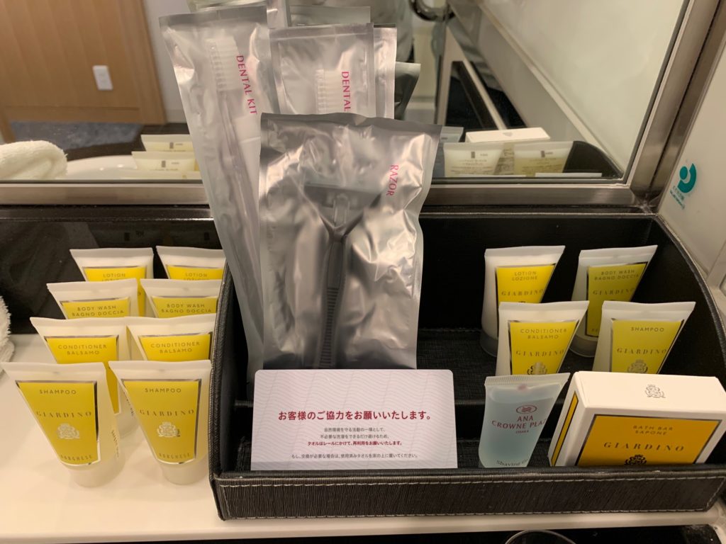 歯ブラシ、折りたたみブラシ、ボディタオル、カミソリ、シャワーキャップ、ヘアゴムなどが置かれています。