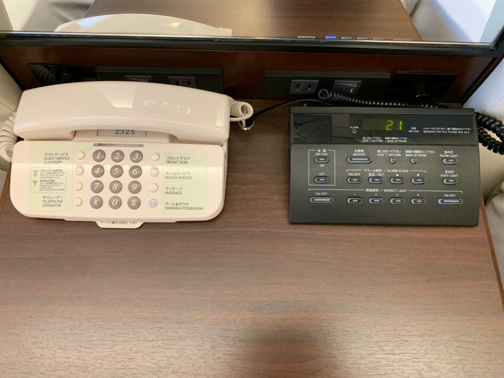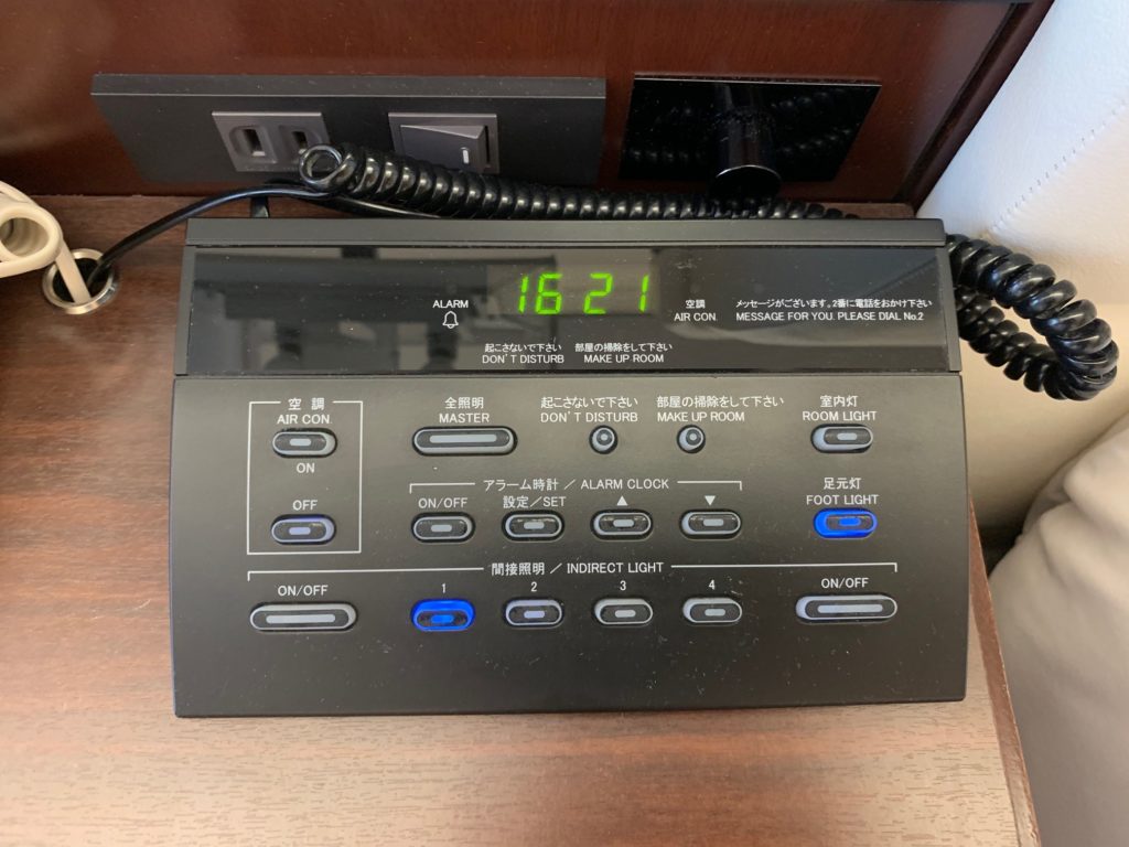 枕元にはコンセントと電源のスイッチ、電話、コントロールパネルがあります。