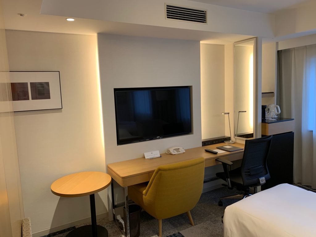テレビは壁に埋め込みされています。デスクは広いですね。