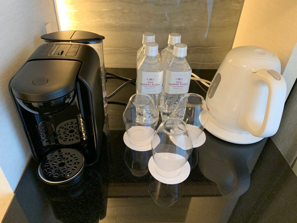 コーヒーマシーン、電気ケトル、サービスのミネラルウォーターが置かれています。