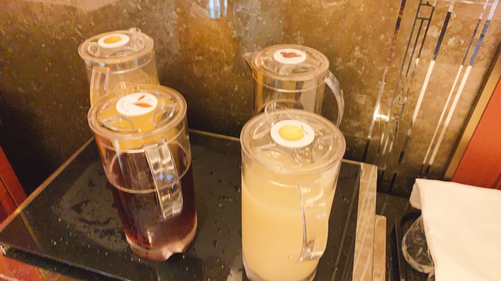 アイスコーヒー、アイスティー、オレンジジュース、グレープフルーツジュース