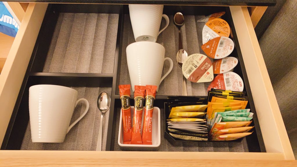 引き出しの中はカップや無料のコーヒーなどが入っています。