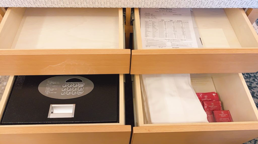 ラゲッジスペースの下には引き出しがあり、セーフティボックス、ワンピースタイプのパジャマ、ANAクラウンプラザホテルおなじみの「スリープアドバンテージ」が入っています。