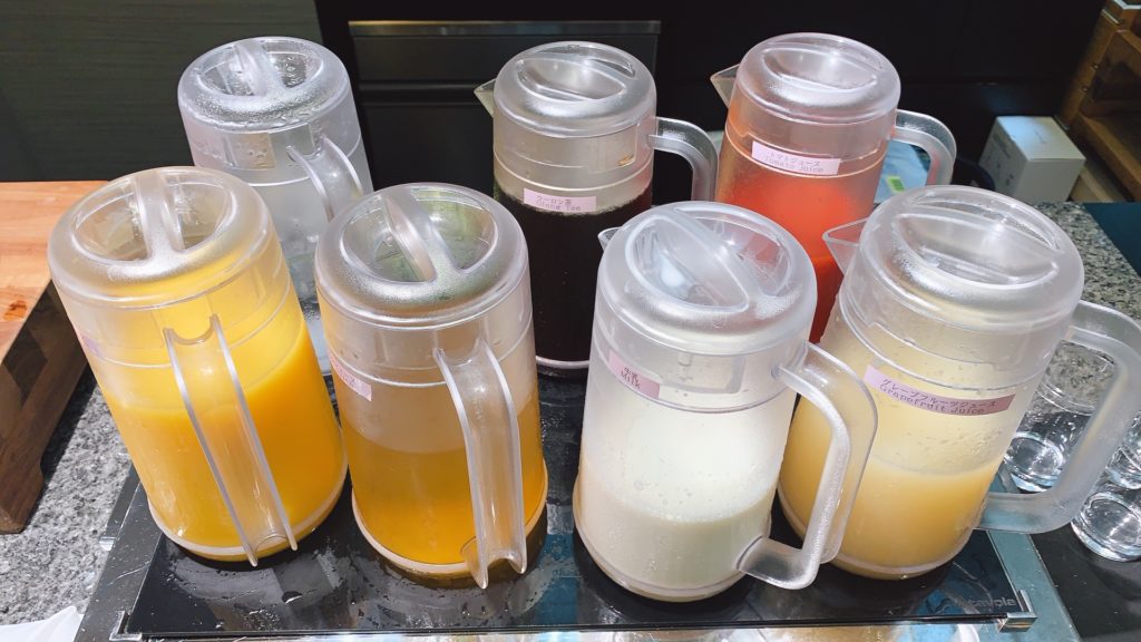 オレンジジュース、アップルジュース、グレープフルーツジュース、トマトジュース、牛乳、ウーロン茶