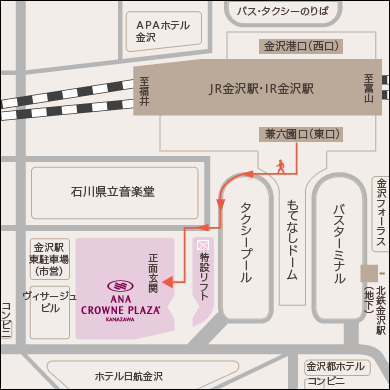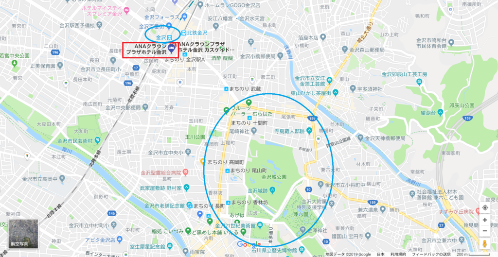 ANAクラウンプラザホテル金沢は金沢駅前にあります(下の地図赤四角)。