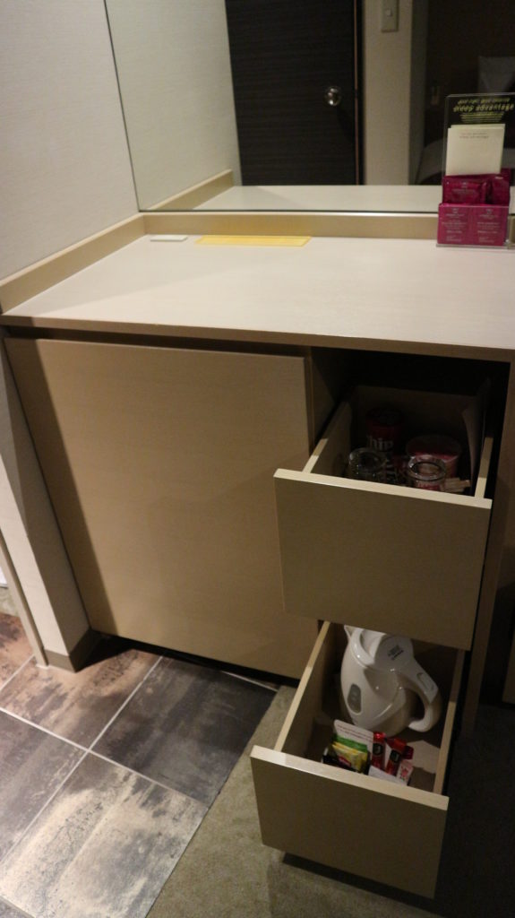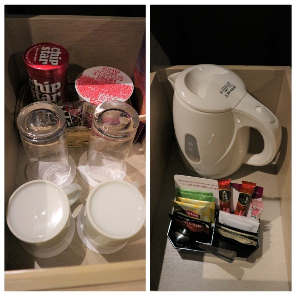引き出しの中身は上段はグラスやカップ、ミニバーのカップ麺やポテトチップス、下段は電気ケトルに無料のコーヒーや紅茶などとなっています。