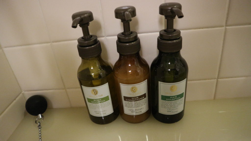 バスタブにはDHCオリーブゴールドシリーズのシャンプー、コンディショナー、ボディソープも置かれています