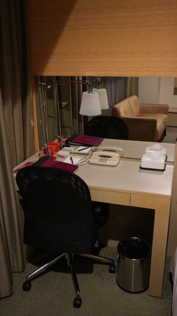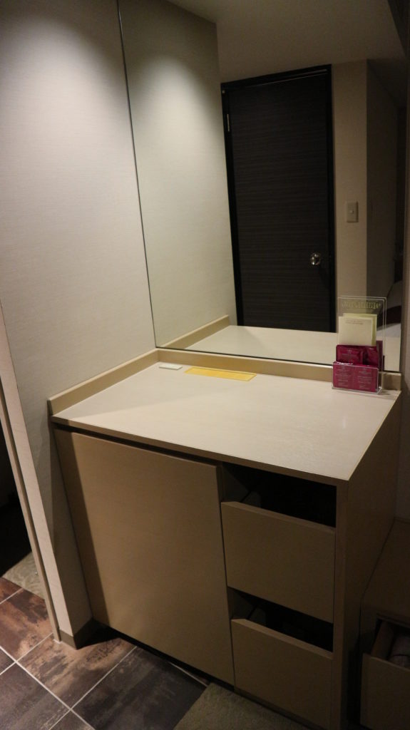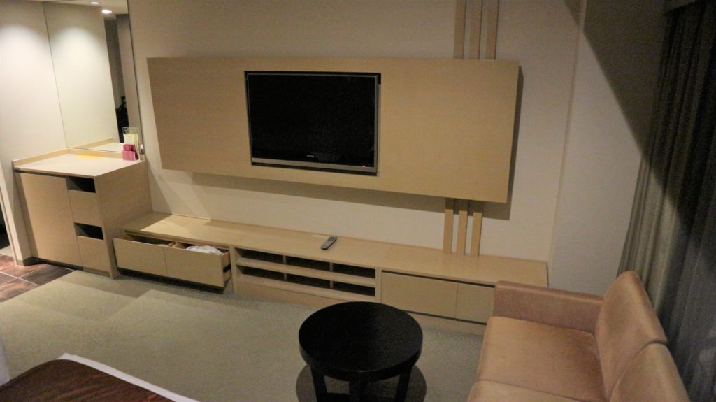 ベッドの向かい側には大きなテレビ台があります。こちらのテレビ台は上にちょっとした荷物が置けて滞在中にどんどん増えるお土産や仕事の書類を置いておくことができ大変便利でした。