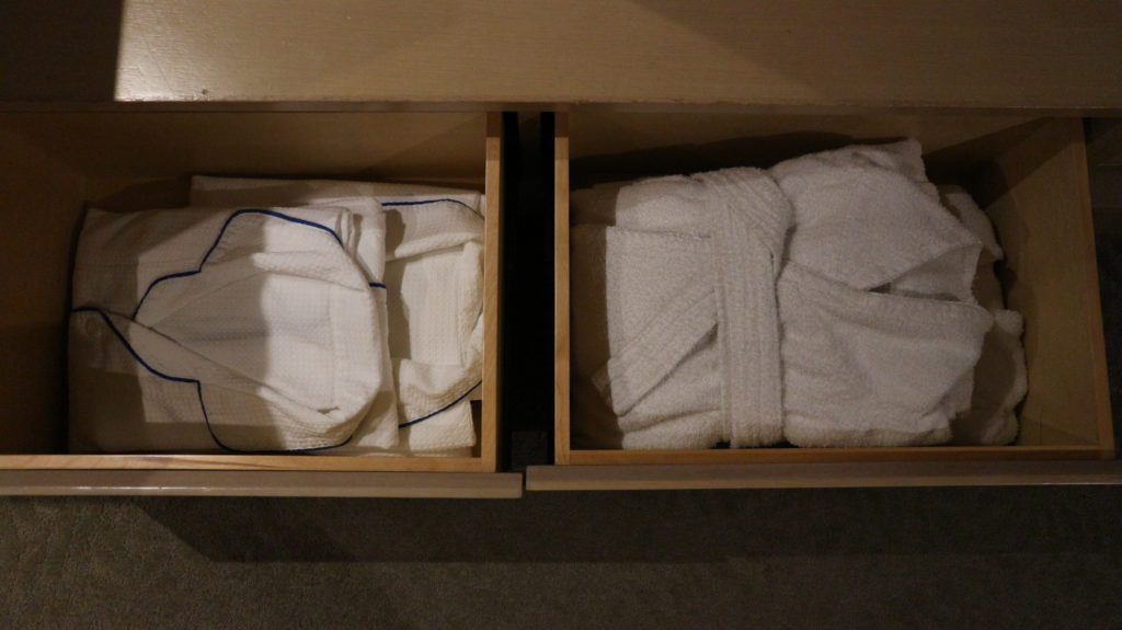 左下の引き出しの中にはパジャマとバスローブが入っています。ちなみに右下の引き出しの中は一つは空っぽ、一つはセーフティーボックスでした。