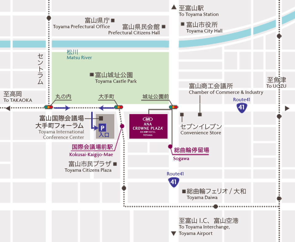 ANAクラウンプラザホテル富山(下の地図青矢印)は富山駅(下の地図赤四角)からは徒歩15分ほどの場所にあります。大きな荷物を持って歩くのが辛い時は富山駅からタクシーなら5分、800円前後、市内環状線セントラムならホテルのすぐ横にある「国際会議場前」駅(下の地図緑丸)まで6分、180円で到着します。