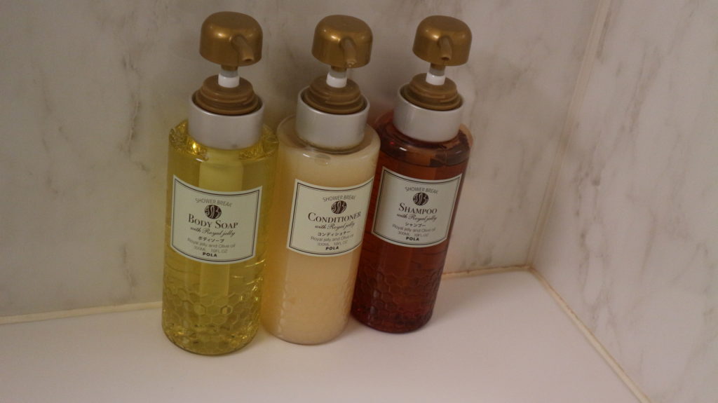 浴槽にはPOLAのシャンプー、コンディショナー、ボディソープが置かれています