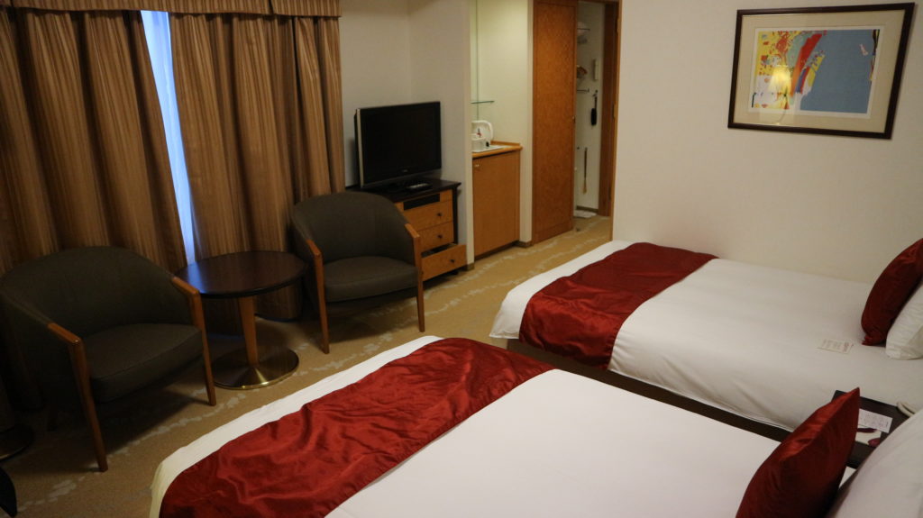 ANAクラウンプラザホテル富山レギュラーフロアデラックスツインの室内をご紹介します。また、今回は最安レギュラーフロアシングルルームの予約でしたがアップグレードして頂いた上に、お得な値段で宿泊できましたので、IHGリワーズクラブ会員特典やSFCプランといった宿泊割引についてもご紹介します。