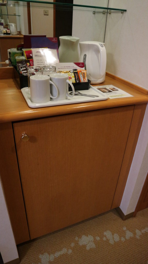 入り口側のキャビネットの上には電気ケトル、カップ、グラス、コーヒー、紅茶などが置かれています。