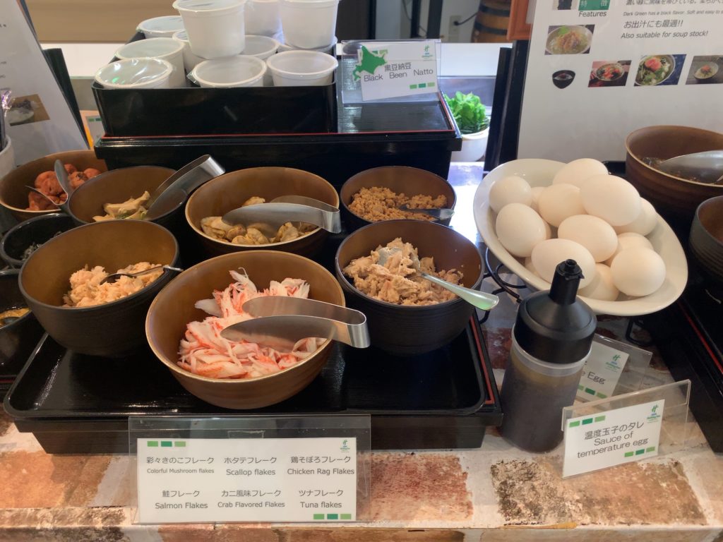 黒豆納豆、温泉玉子、彩々きのこフレーク、鮭フレーク、ホタテフレーク、カニ風味フレーク、鶏そぼろフレーク、ツナフレーク
