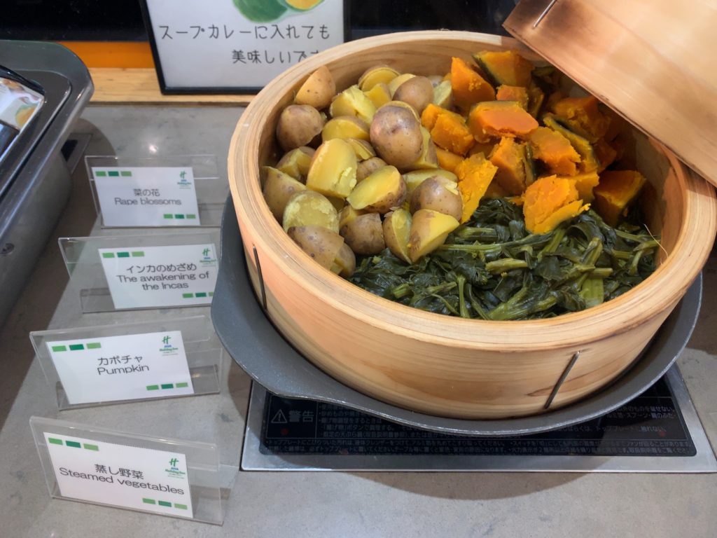 蒸し野菜(菜の花、インカのめざめ、カボチャ)