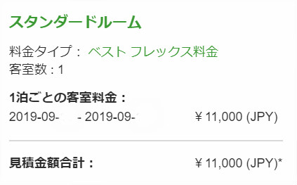 しかし、直前になりどんどん値下がりしてベストフレックス料金で11000円/泊になりました。