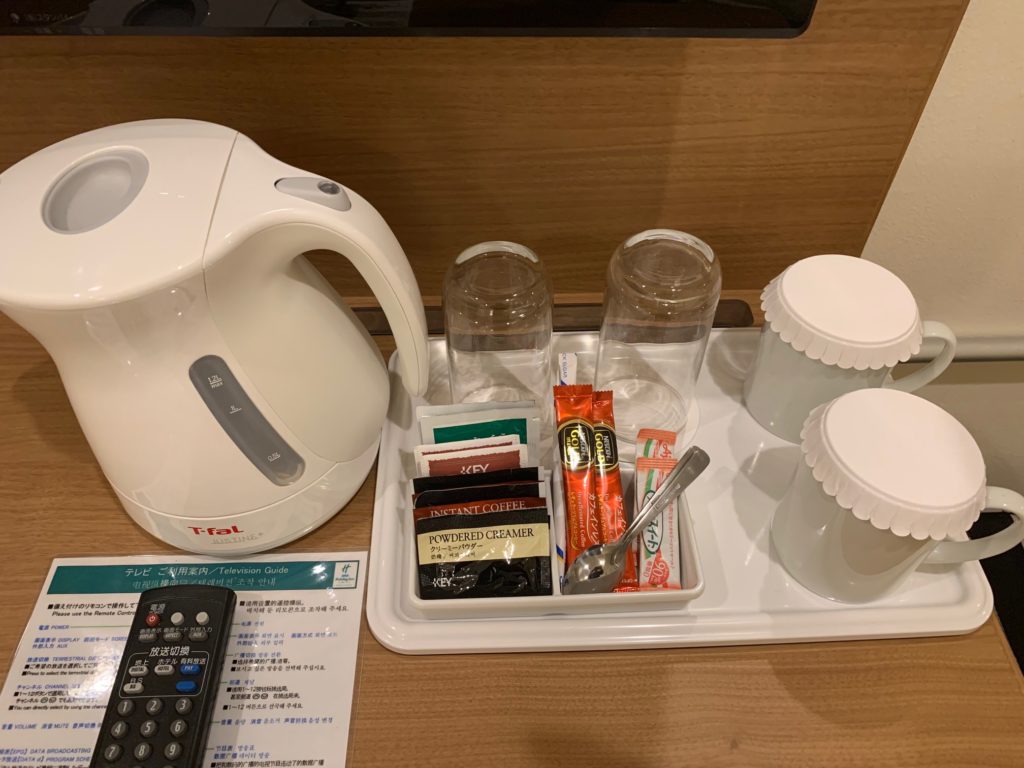 テーブルの上には電気ケトル、カップ、グラス、お茶、紅茶、インスタントコーヒー、カフェインレスコーヒーが置かれています