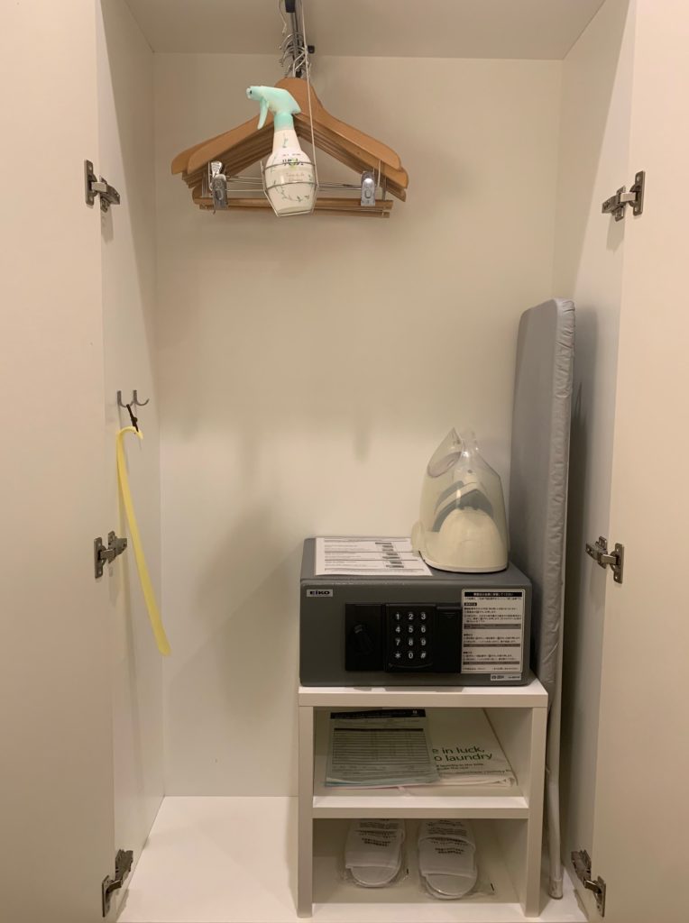 ベッド横のクローゼットの中はこのような感じです。セーフティボックス、スリッパ、アイロン、アイロン台、ハンガーがあります。