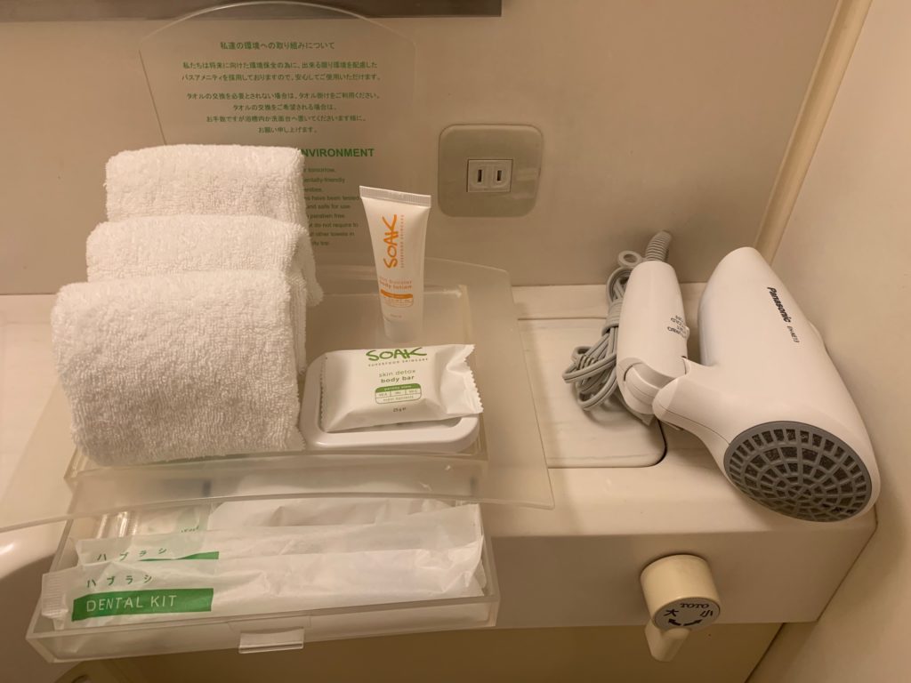 アメニティはヘアーブラシ、綿棒、カミソリ、歯ブラシなど最小限です。石鹸やボディーローションもあります。