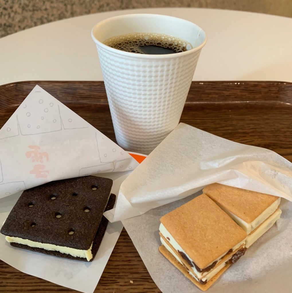 マルセイバターサンドで有名な六花亭ですが、持ち帰りが困難なマルセイアイスサンド、雪こんチーズがおすすめです。雪こんチーズはサクサクのココアビスケットの間に滑らかで濃厚なベイクドチーズケーキが挟まれておりとても美味しいです。