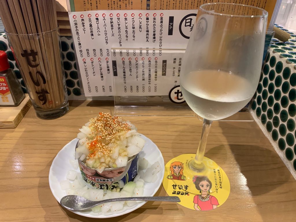 15時からオープンしており昼飲みもできる立ち飲み屋さんです。立ち飲みと言ってもオシャレなので女性一人でも入りやすそうです。個性的なフードが印象的で飲み物も豊富です。上の写真は「サバサラ」!さば缶にどっさりタマネギが乗っておりゴマ油とゴマがかかってます。酒が進む一品です。