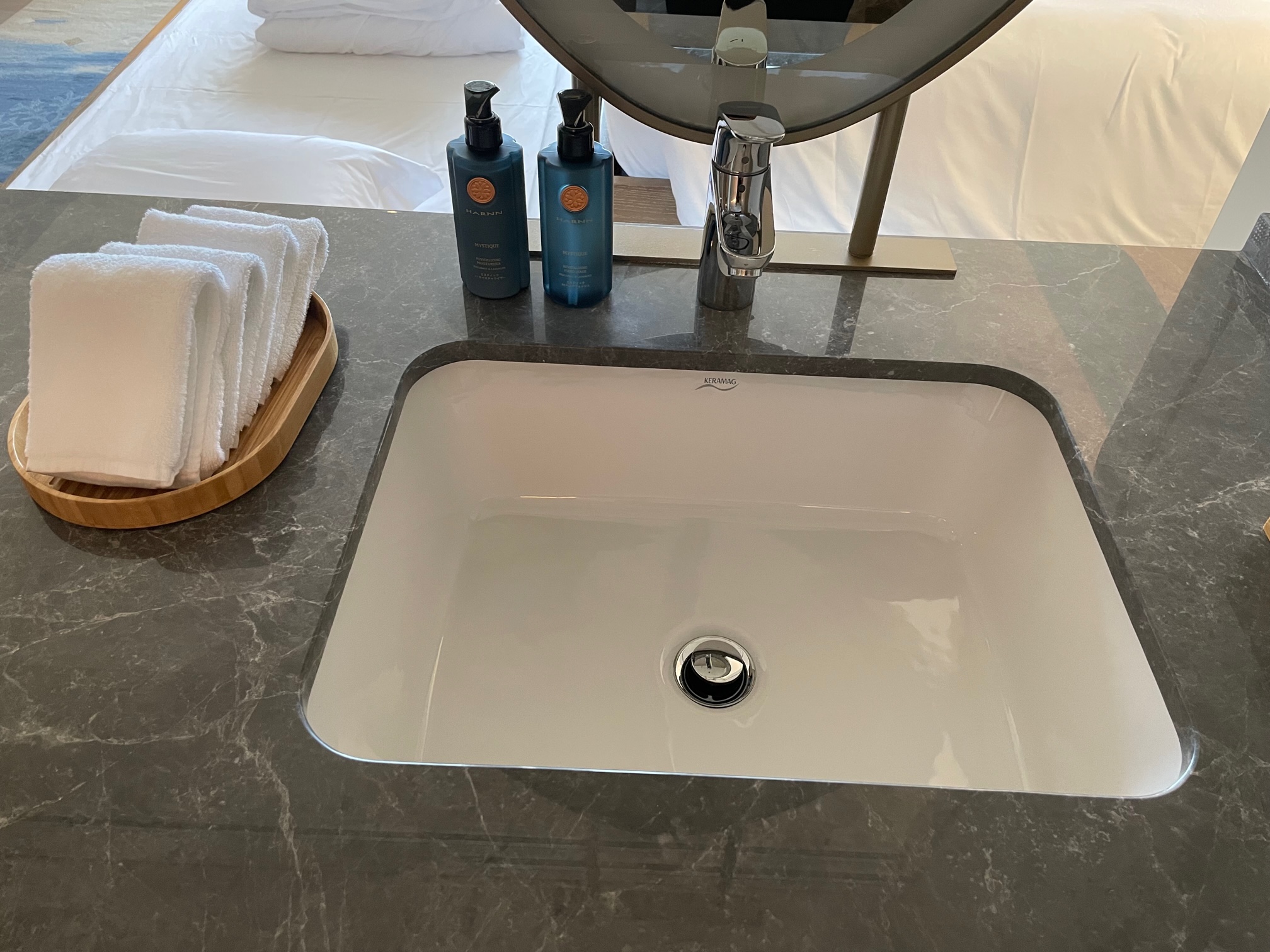洗面台のサイズの割にシンクは小さめです。小さなタオルが横に置かれています