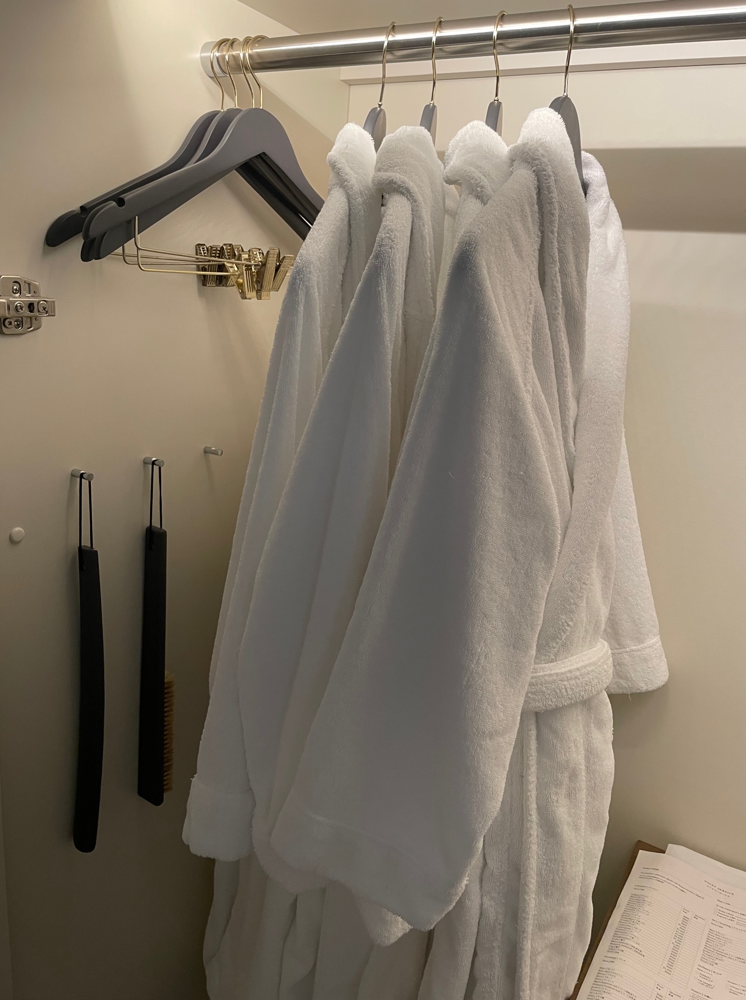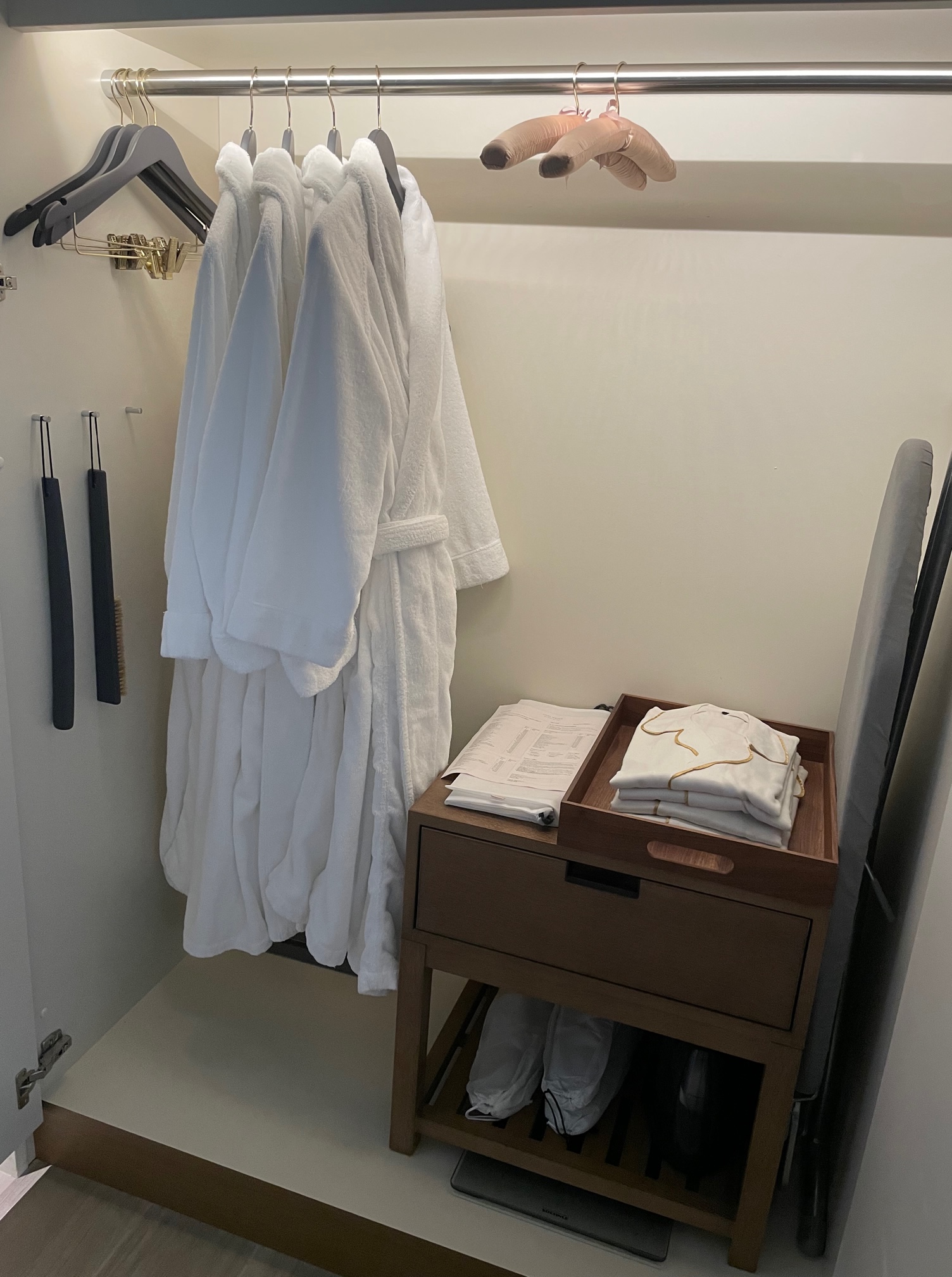 バスローブが4つかかっています。その他ハンガー、靴ベラ、ブラシ、アイロン台など