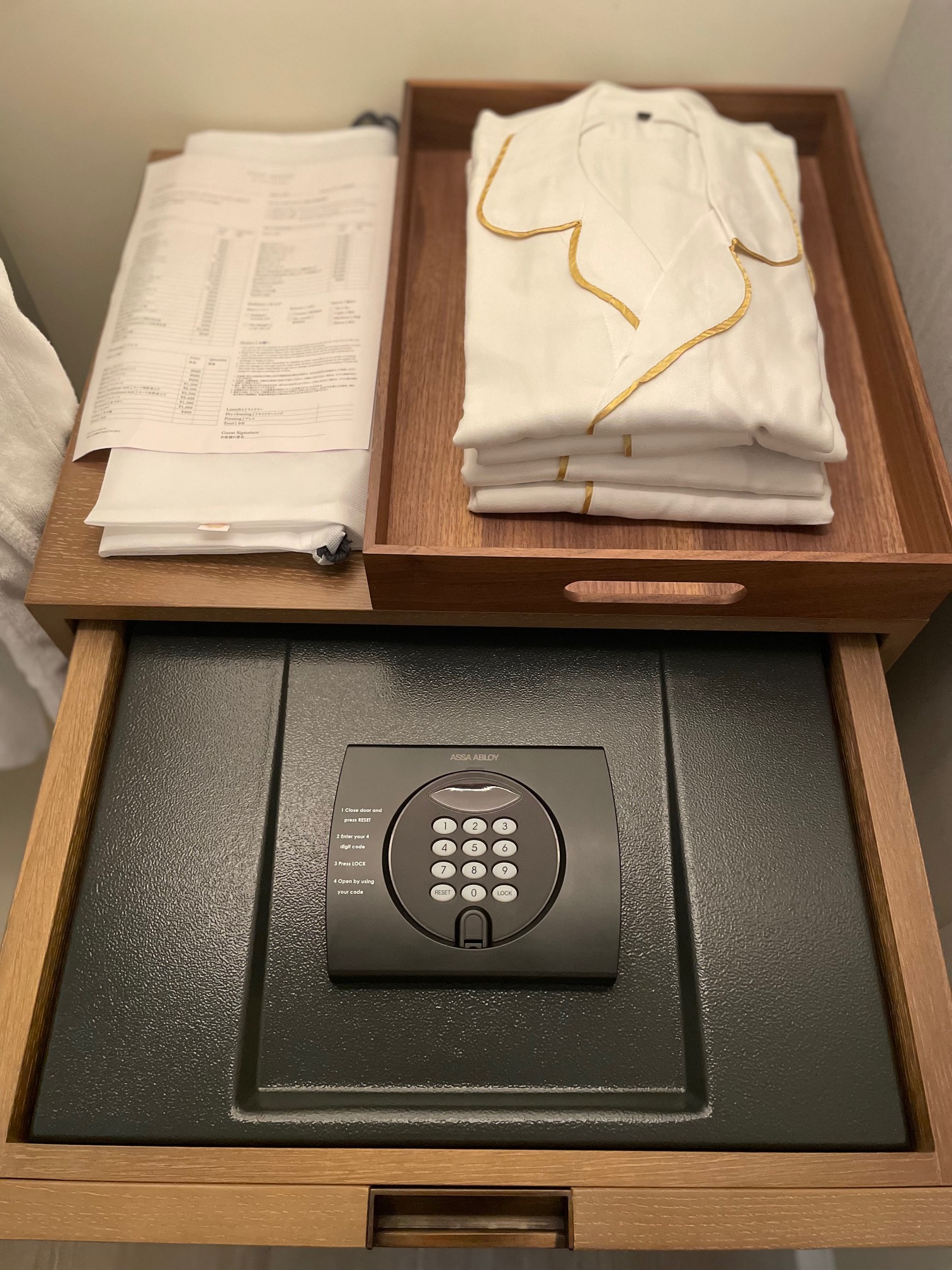 引き出しを開けると中にはセーフティボックス、その上にはランドリーバッグ、伝票、パジャマ