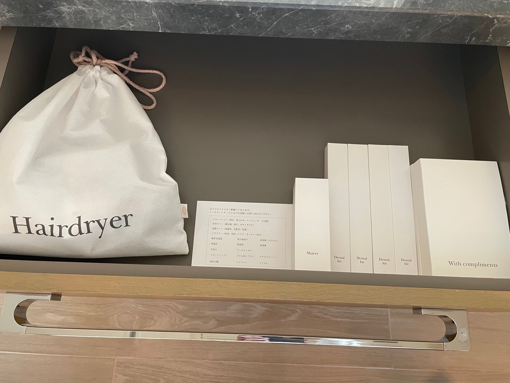 洗面台の引き出しを開けるとドライヤーとアメニティ