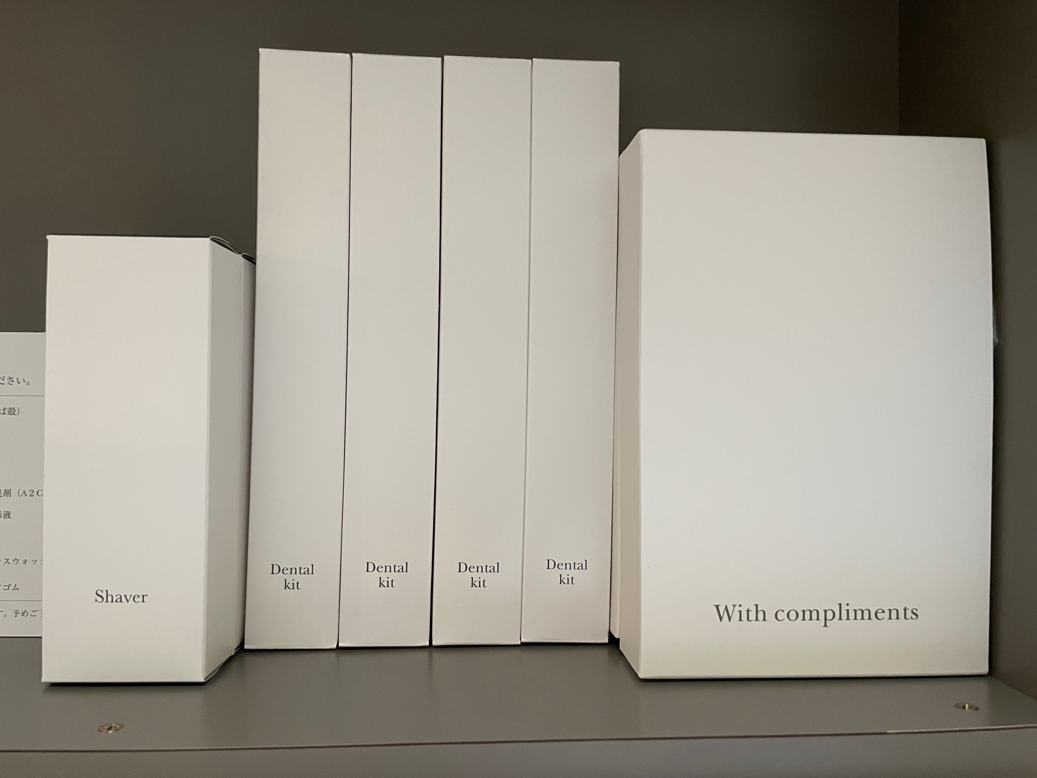 アメニティは歯ブラシ、カミソリ、その他ヘアブラシ、シャワーキャップ、ソーイングセット、コットン、綿棒などが入っている箱