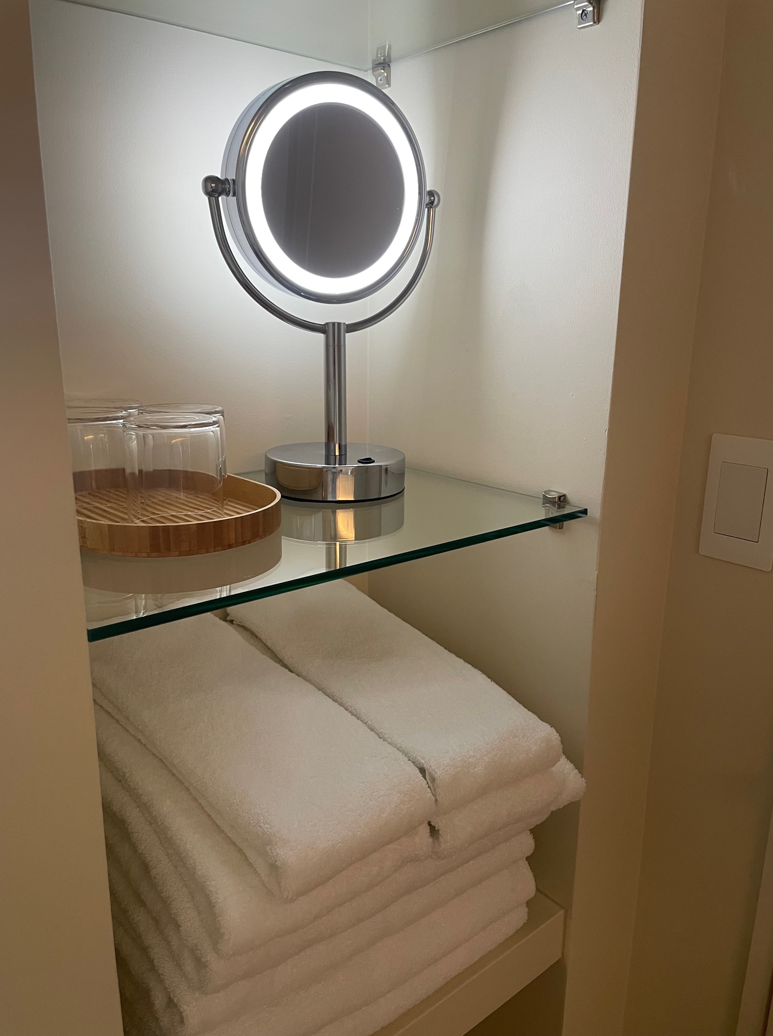 洗面台の横の棚には女優ライト付きミラー、コップ、タオルが置かれています