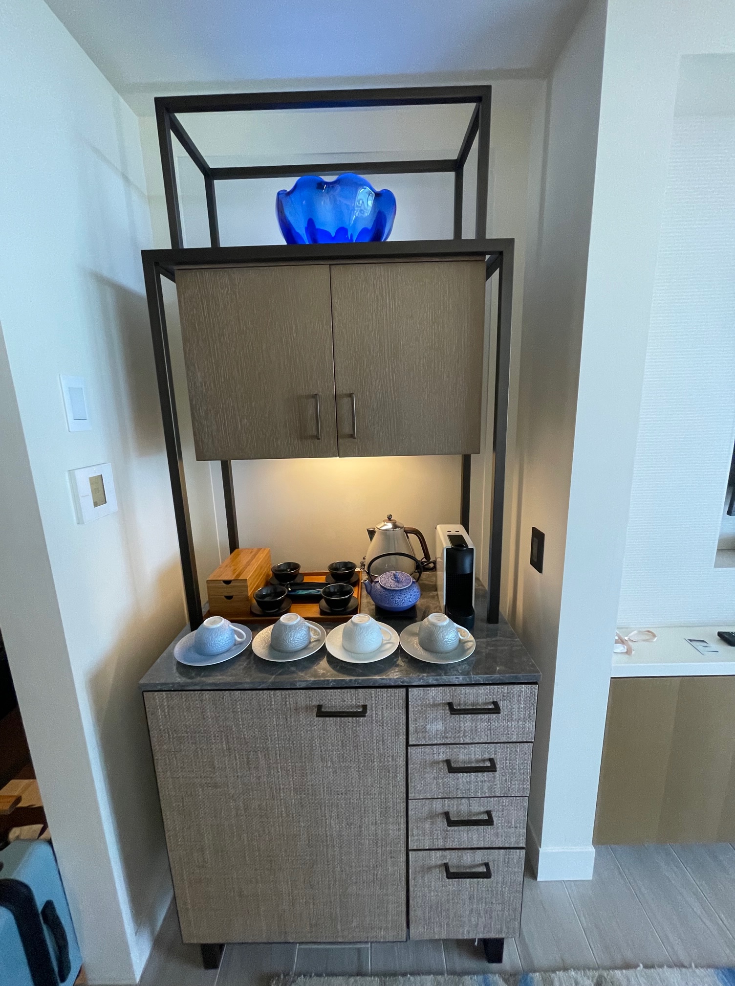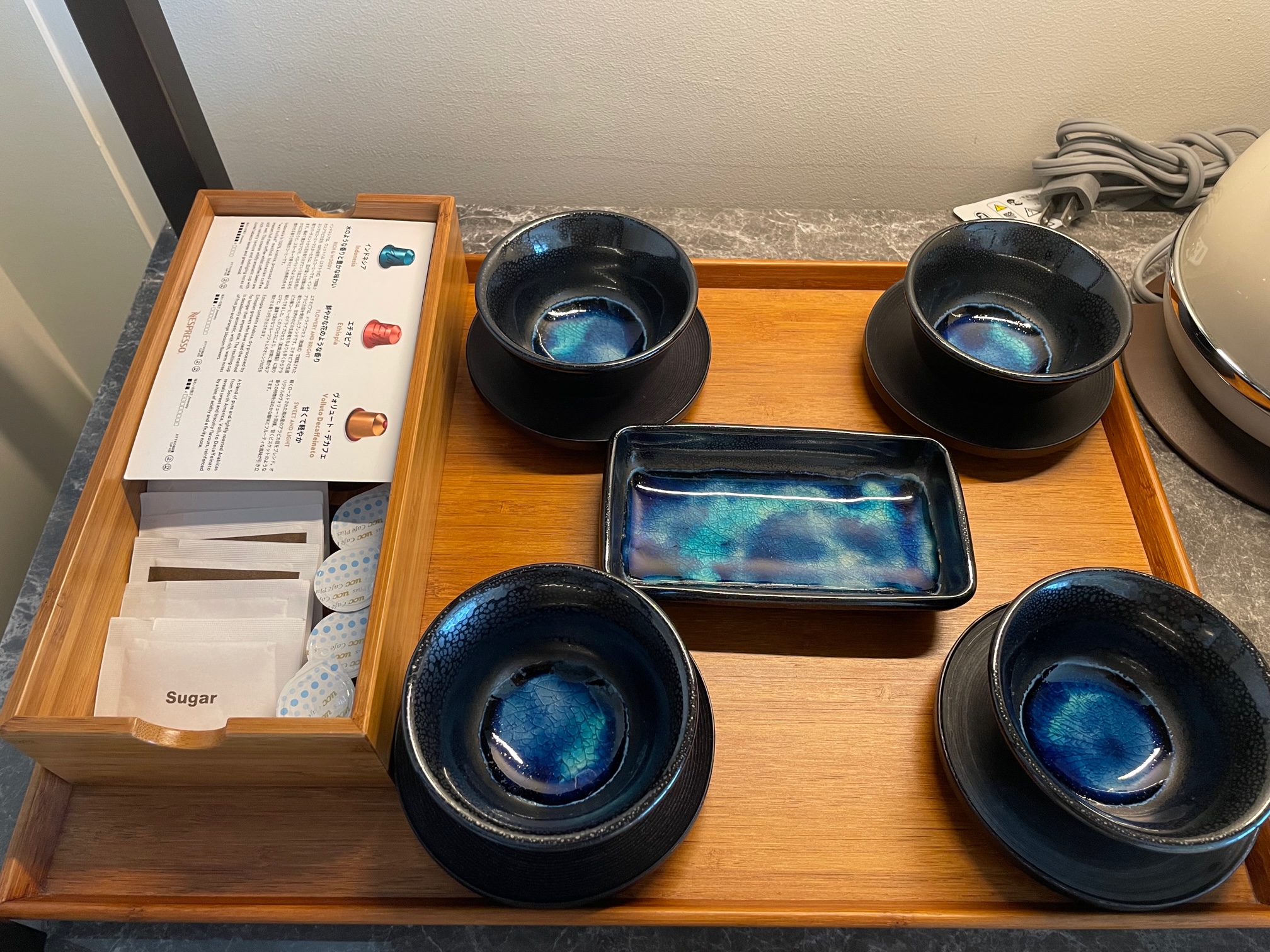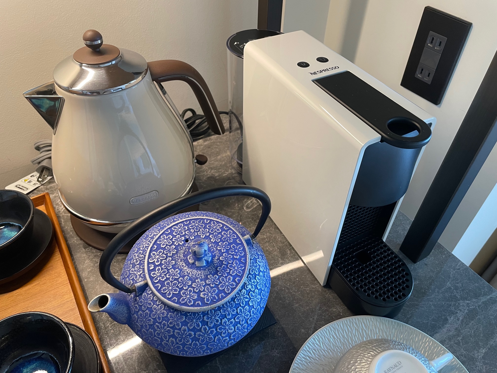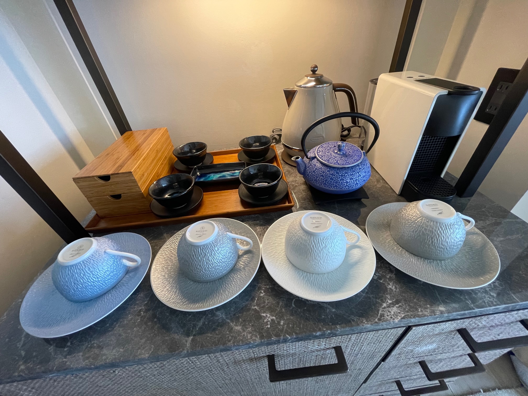 中段にはカップ&ソーサ、湯呑み、急須、電気ケトル、ネスプレッソが置かれています
