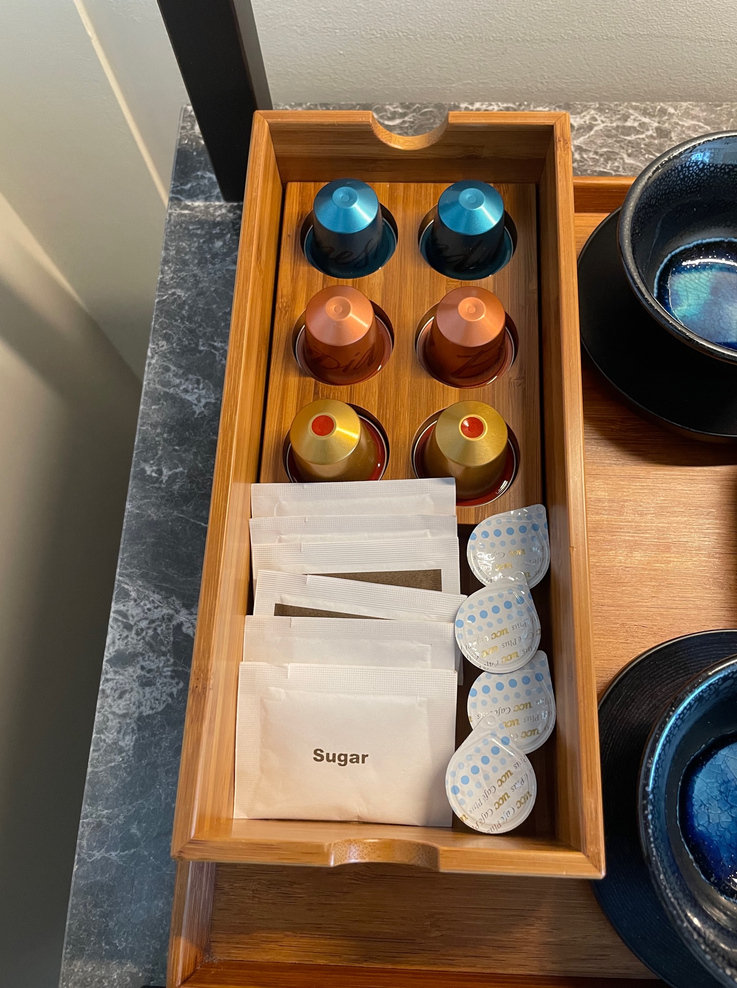 木の箱の下段にはネスプレッソのカプセルなど