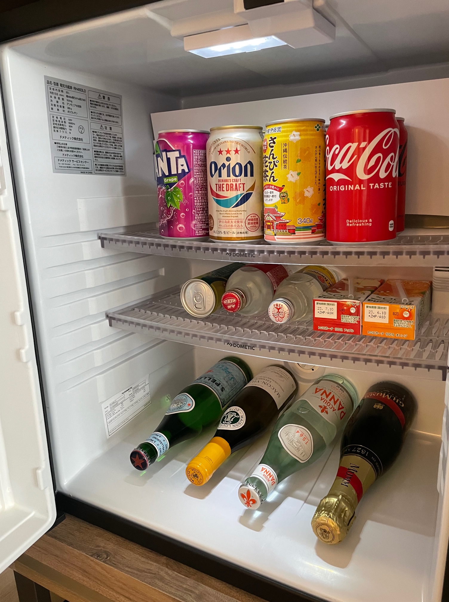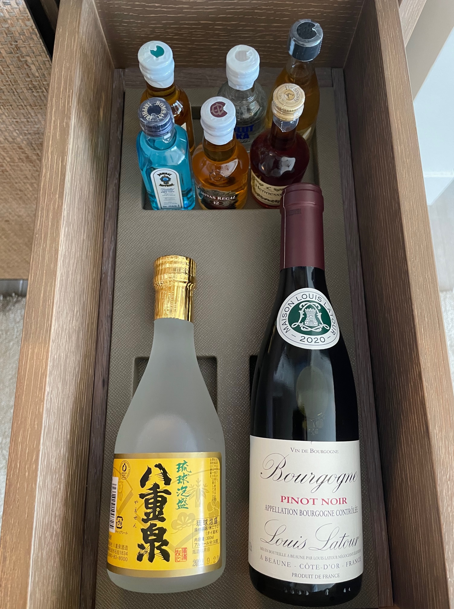 2段目はミニバーのリキュールのミニチュアボトルや泡盛、ワイン