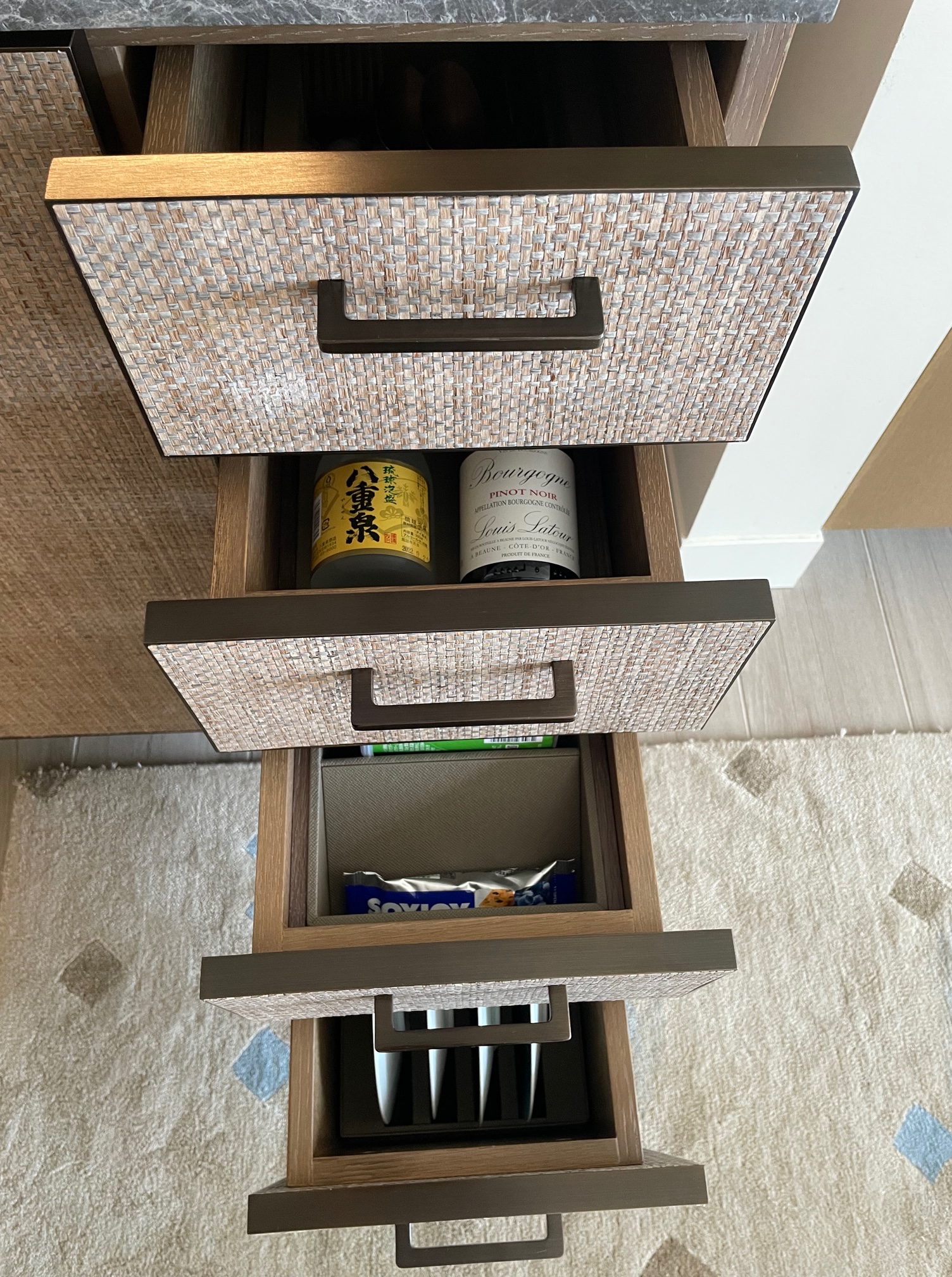 右側の引き出しにはミニバーのお酒やスナック、カトラリーなど