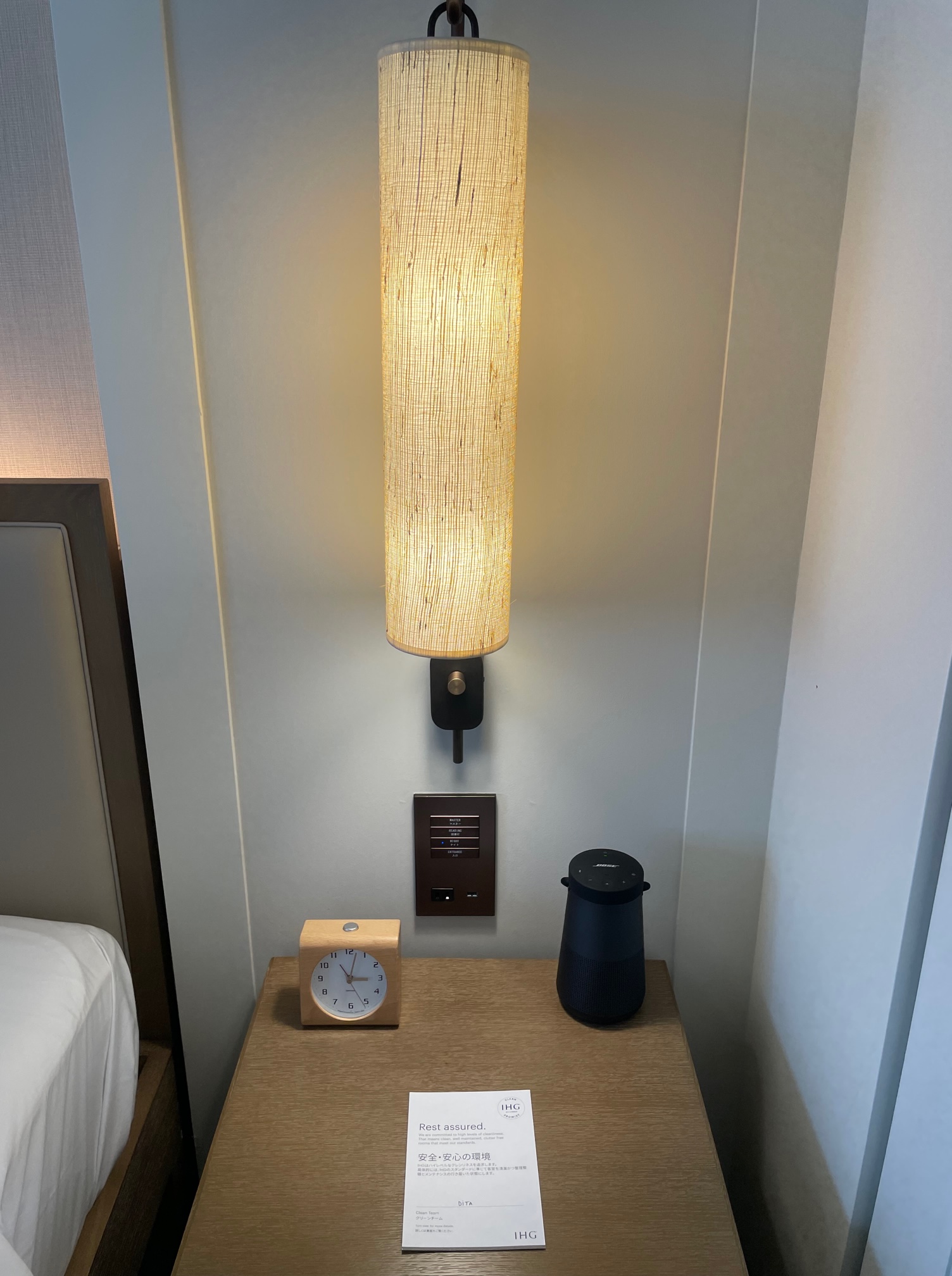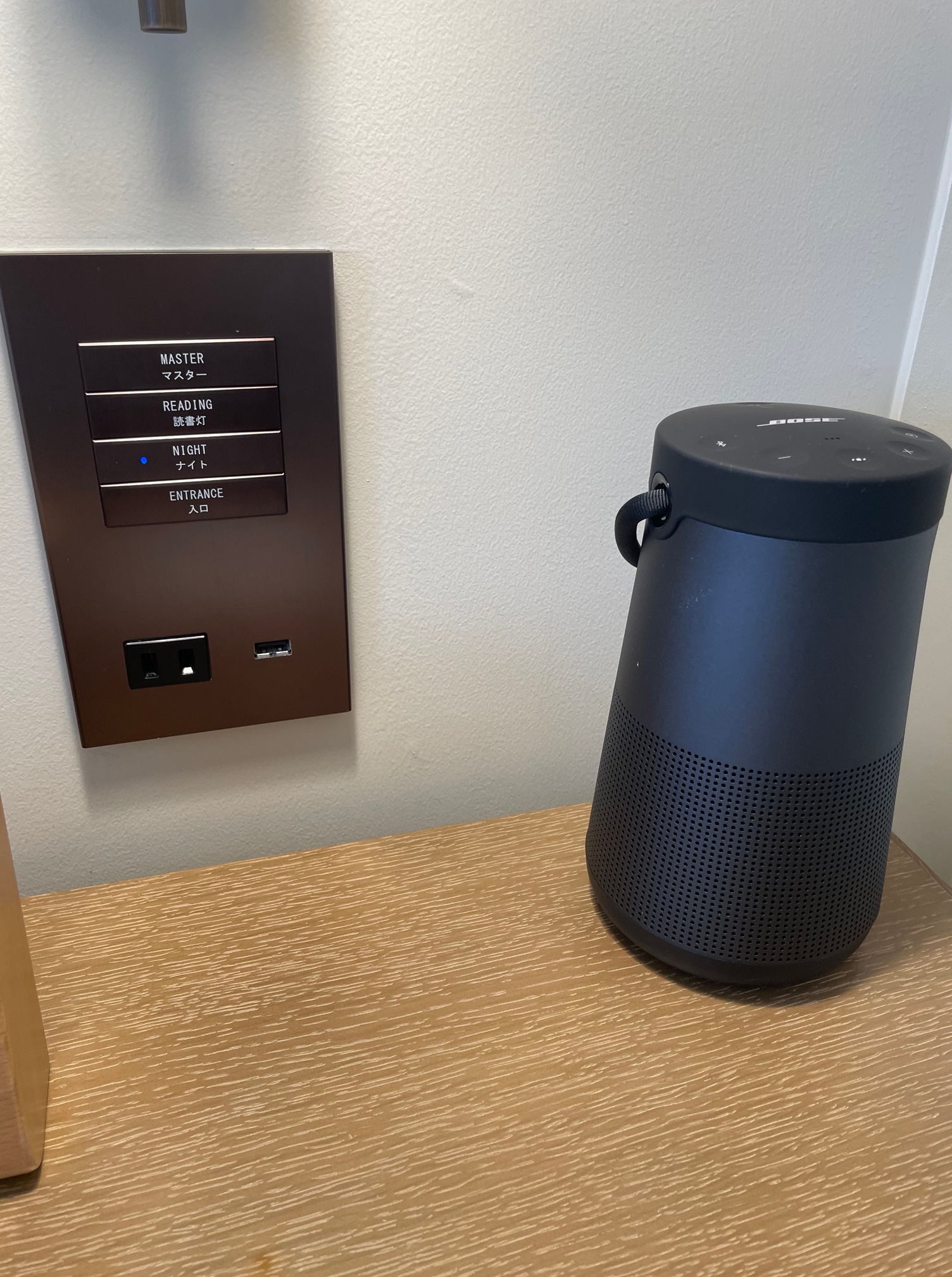 ベッドの右側は照明の電源、目覚まし時計、BOSEのBluetoothスピーカー