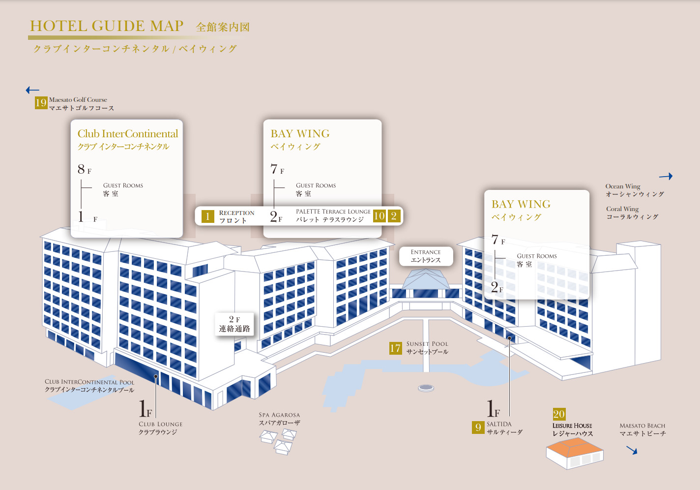 2020年7月に新棟「クラブインターコンチネンタル」1棟と「ベイウィング」2棟の新館3棟を開業し、客室数はそれまでの255室からほぼ2倍の全458室となり、総面積31ヘクタール(東京ドームの約6倍)の広大な敷地に5つの棟、屋内外の4つのプールを有する巨大リゾートになりました。