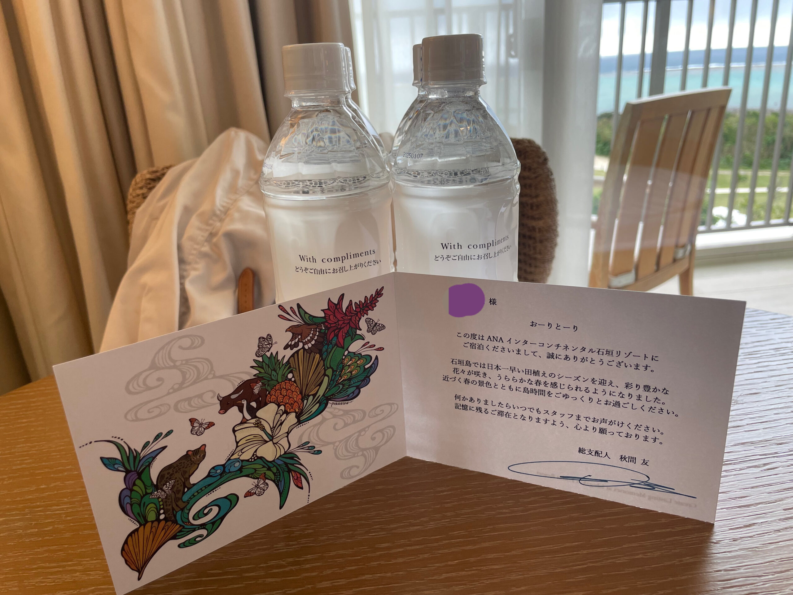 テレビの横のテーブルにはサービスのミネラルウォーターとウェルカムレターが置かれています