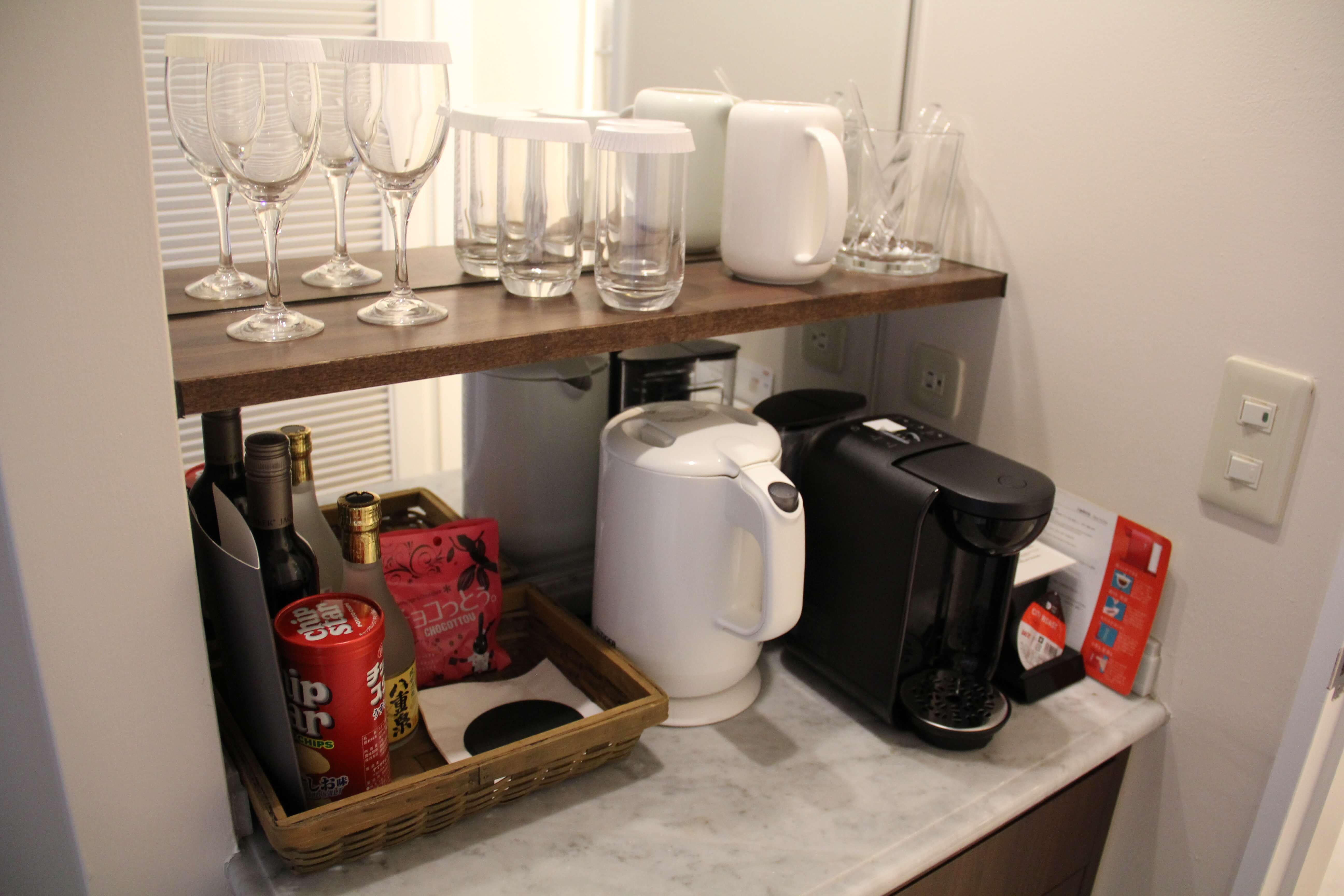 冷蔵庫上にはコーヒーマシーンやミニバーのドリンクやフードなどが並んでいます