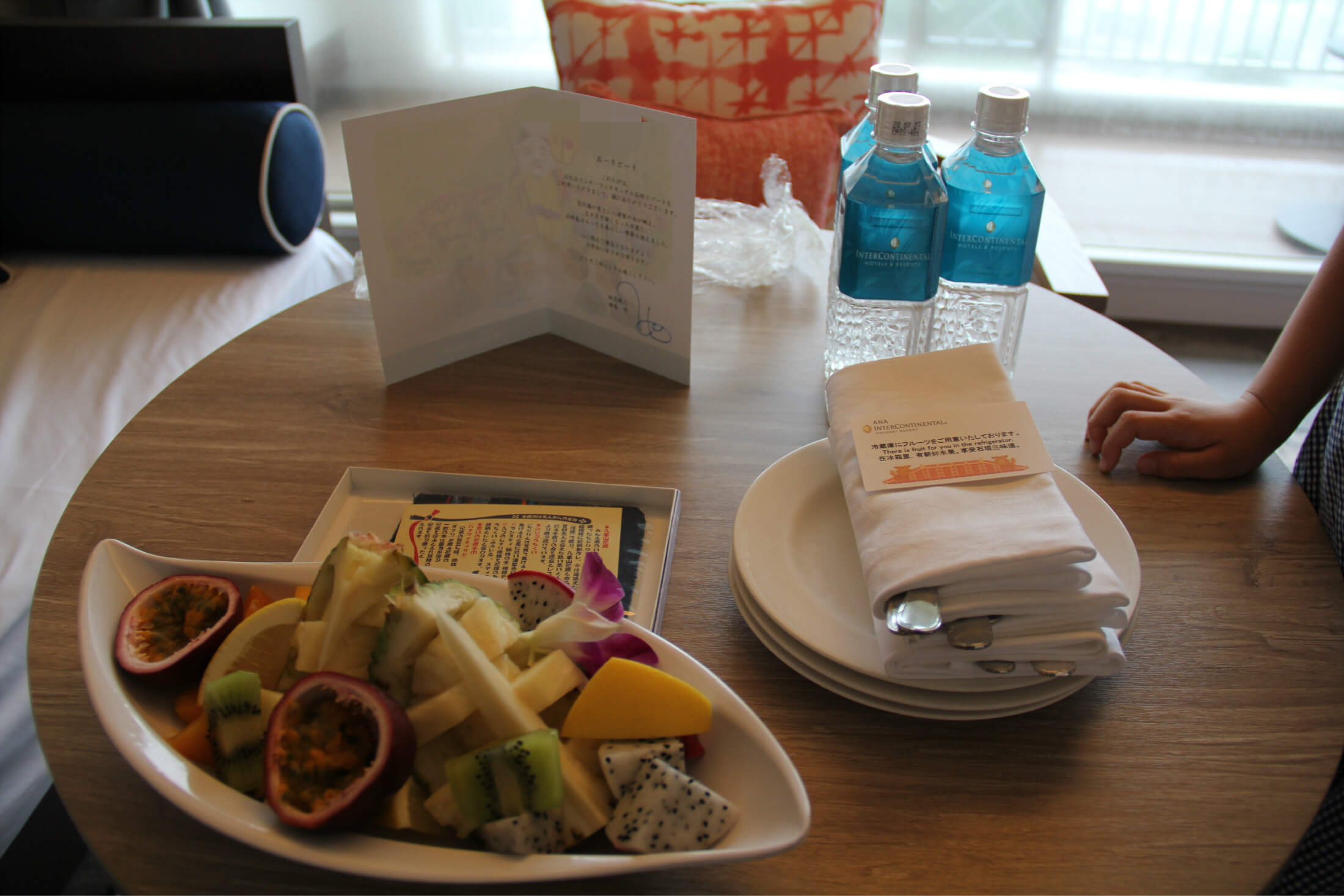 冷蔵庫の中身は以下のようになっています。中のドリンクは全て有料です。ちなみにフルーツは後述するインターコンチネンタルアンバサダー特典のウエルカムフルーツになります。
