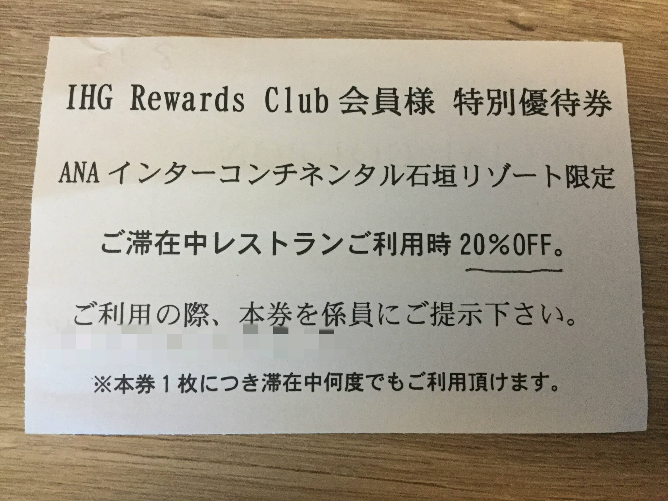 ANAインターコンチネンタル石垣リゾート限定のサービスとしてIHGリワーズクラブ会員はレストラン20%オフチケットをチェックイン時に頂くことができます。